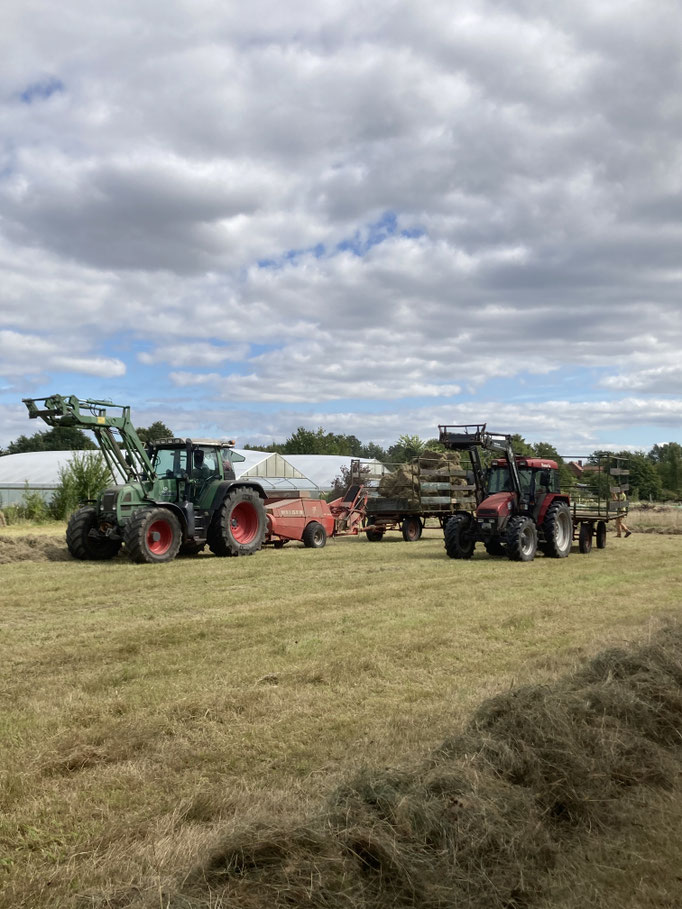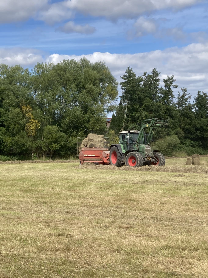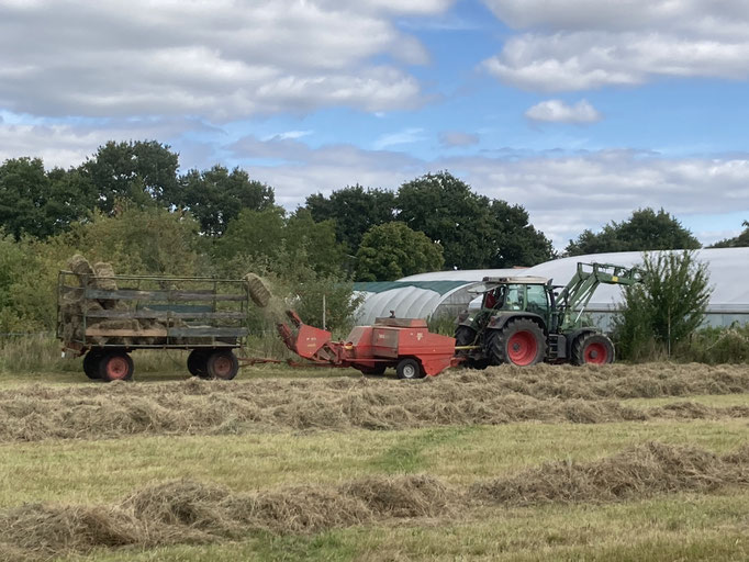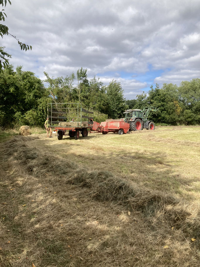 Am 19. August haben wir den Sprung ins kalte Wasser gewagt und endlich einen Teil unserer Heuwiesen gemäht. Das Wetter meinte es leider nicht ganz so gut mit uns, einmal hat es leicht reingeregnet. Dafür hat der stets verlässliche norddeutsche Wind in Kombination mit Wärme und auch etwas Sonne das Heu dennoch gut durchgetrocknet. Am 25. August konnten wir das Heu pressen lassen. Auch hier nochmal vielen Dank an alle Helfer!